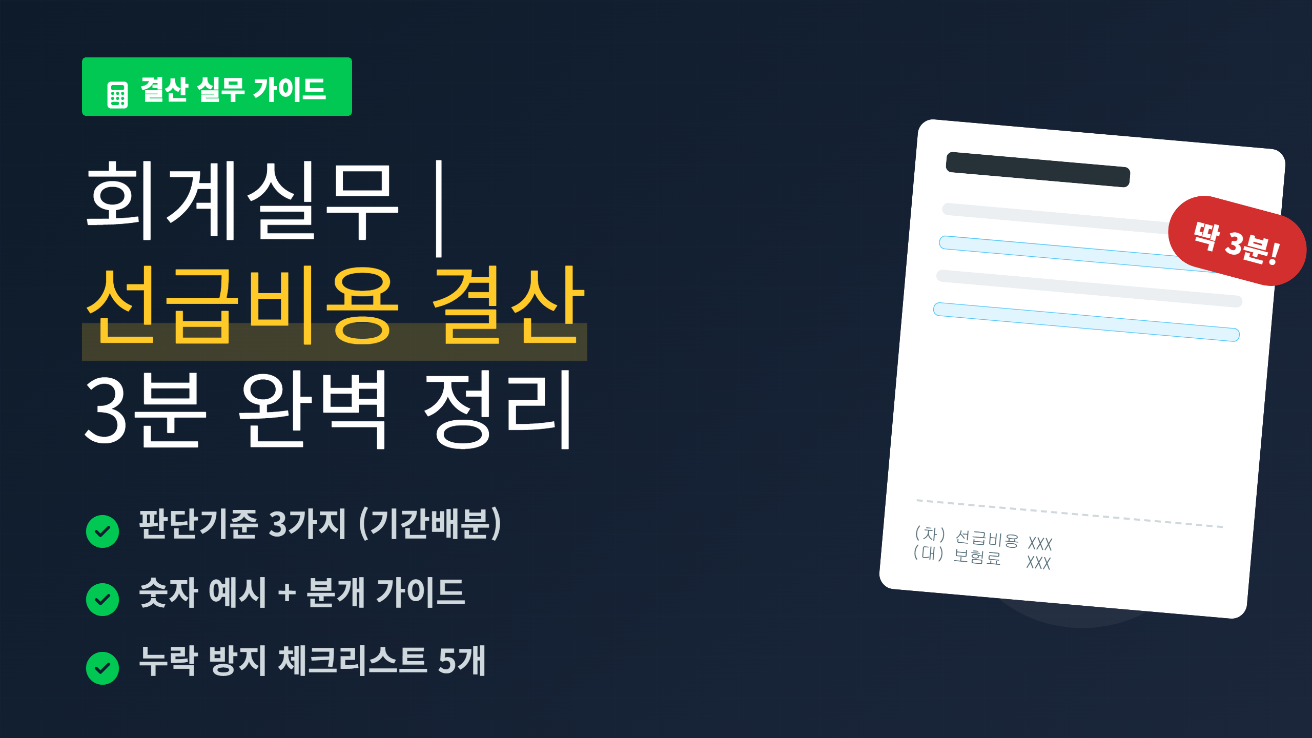 | 선급비용 인식 | 결산일 잔여기간 있으면 가능(권장) | 서비스 기간 명확/합리적 안분 가능 | 계약서, 청구서, 결제내역 | 기간 불명확 시 근거(약관/이용기간) 보완 |