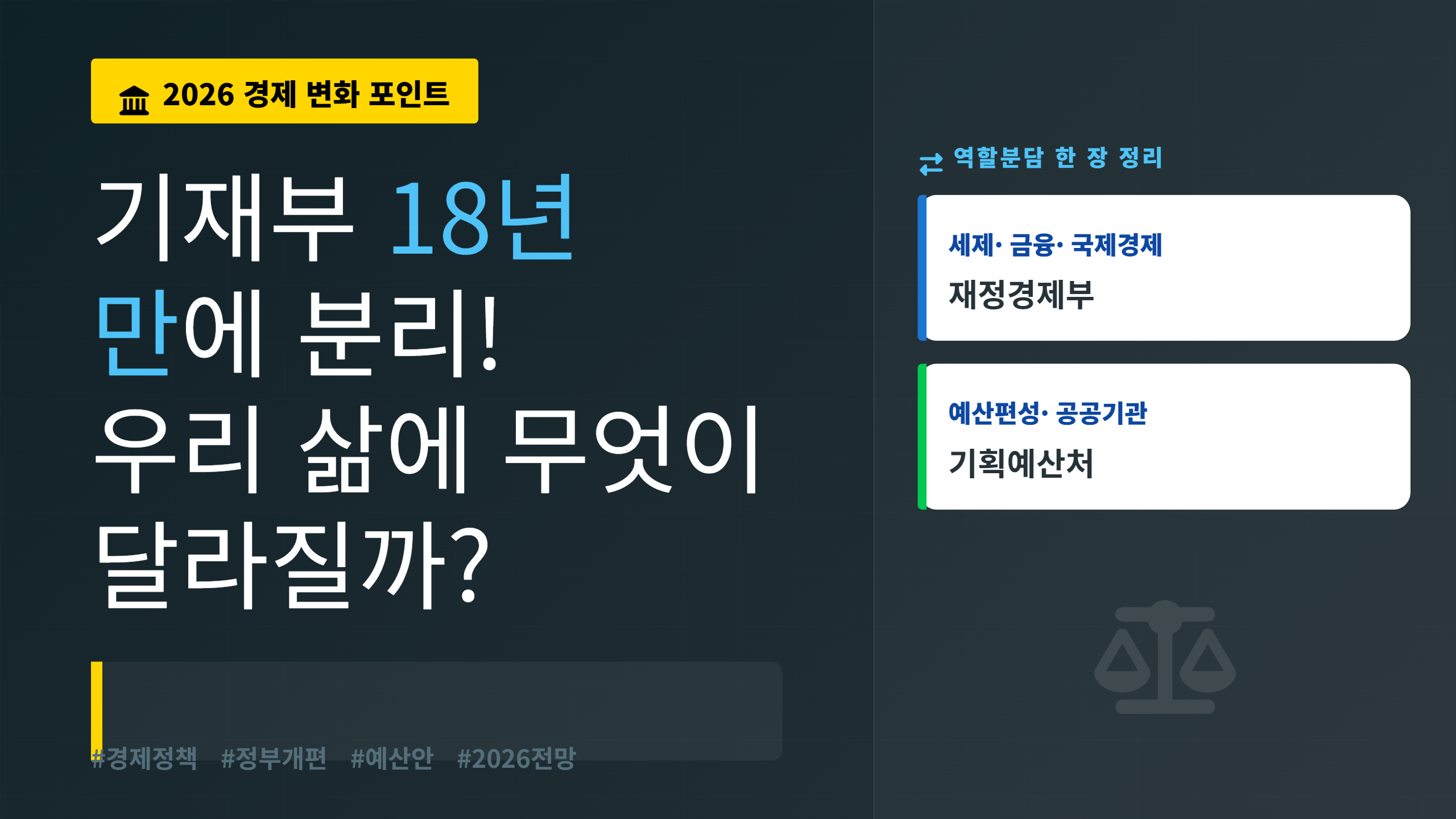 18년 만에 ‘각방’을 쓰게 된 재정경제부와 기획예산처가 협력과 견제를 통해 2026년 경제 정책의 실효성을 높일 수 있을지 지켜볼 포인트예요.